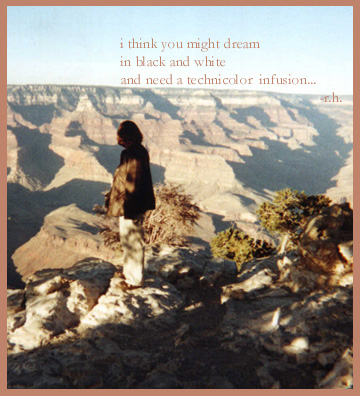 information: this is interlunar, version 2.0. it's name is derived from a margaret atwood poem of the same title. the pictures were taken at the grand canyon in nov. '99 by me. the ones with me in them were taken by amanda. the pictures in biograph are web-cam self portraits (i'm so high-tech). this page is best viewed on explorer with 800 x 600. it was written in notepad with my very limited html skills. it does contain some images that take a while to load. if you have any problems viewing it, let me know, and i will try to adjust it. i have no idea how it looks on netscape as i don't use it. all writting is mine unless otherwise noted. (i occationally use lyrics, and those are mostly credited.) please don't take any of the writing without permission. all the poems were written 1995 to 2000 by me. i have no idea why you would steal anything, but i ask that you don't. this is my third web-page. first, becoming ophelia on tripod, and later copan moire on godawful. several things have changed since i had those pages. this is who i am now. my old writing may at some point be archived. for now, this is what it is. thank you to randall [palesky] for the space and to apryl [noise] for all her help. |